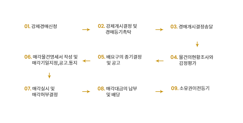 부동산 강제경매라 함은 채무자 소유의 부동산을 압류, 현금화하여 그 매각대금을 가지고 채권자의 금전채권의 만족을 얻음을 목적으로 하는 강제집행절차입니다. 이와 같은 강제경매를 신청하기 위해서는 채권자는 확정판결, 공정증서, 화해조서, 조정조서 등 집행권원을 가지고 있어야 하며, 법원으로부터 집행문을 부여 받아 집행비용을 예납하고 강제경매신청서를 집행법원에 제출하여야 합니다.